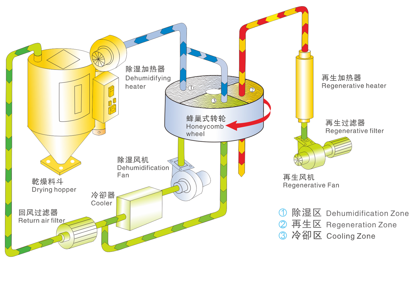 TCD蜂巢式除湿干燥机系列 主要与热风式乾燥机搭配,专门对吸湿性较强的工程塑料(如:Nylon,PC,PBT,PET等)进行高效率的除湿乾燥作业,该系列采用高效能转轮,在搭配冷冻水情况下,能确保-40℃露点的稳定除湿效果。乾燥风量60~10...