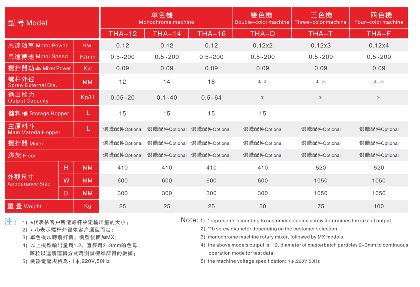 THA-D系列色母机 本机型适用于新料、回收料、色母、添加剂等的自动比例混合。依据预先设定的比例混合,透过微电脑控制世界杯(中国)一站式服务官网设定的条件自动演算出所需之转速( rpm),计量精准。